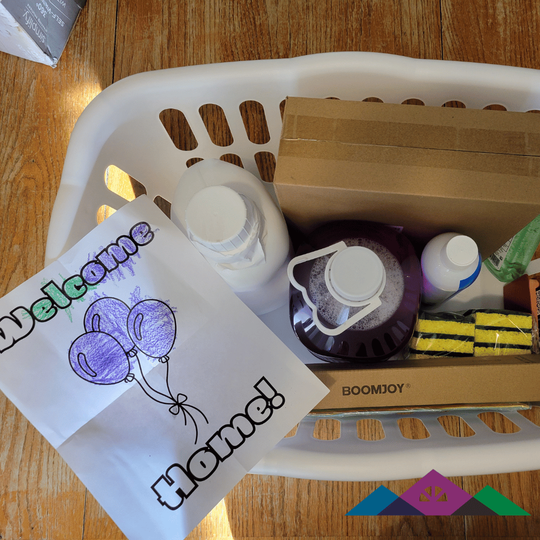 | An example of a Welcome Home cleaning kit, which includes basic essentials for our guests to maintain a clean space of their own. |